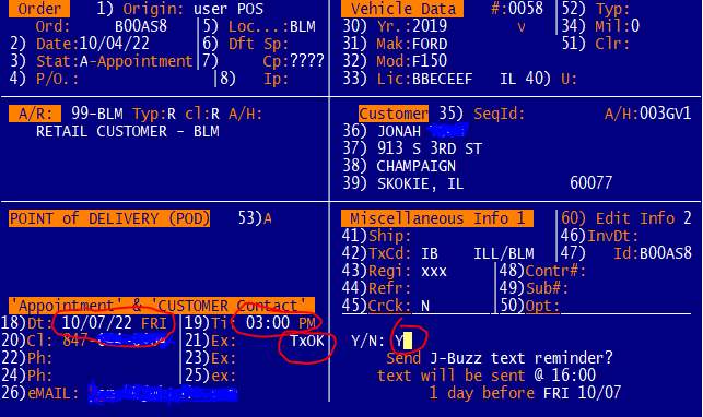 - "John Smith - you have an appt on 10/05 at JMK Tire. Please text to