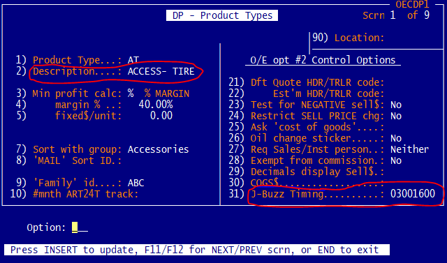 - To set the values go to OE Opt #28, select DP, and select the code value for the product types